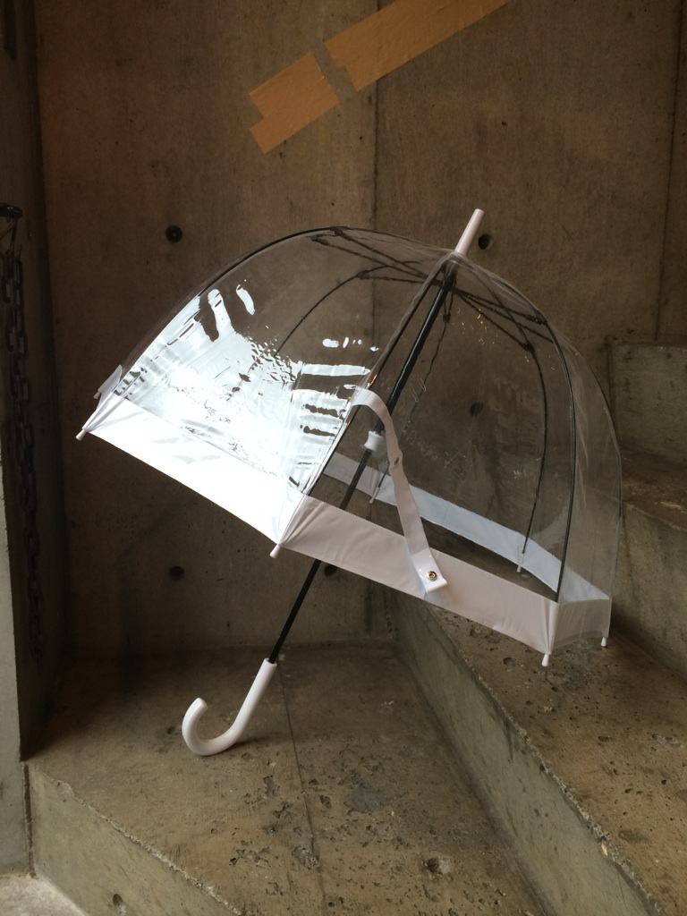 鳥かごの様な丸みを帯びたフォルムが特徴で肩まですっぽりと入るので濡れにくく機能的です。